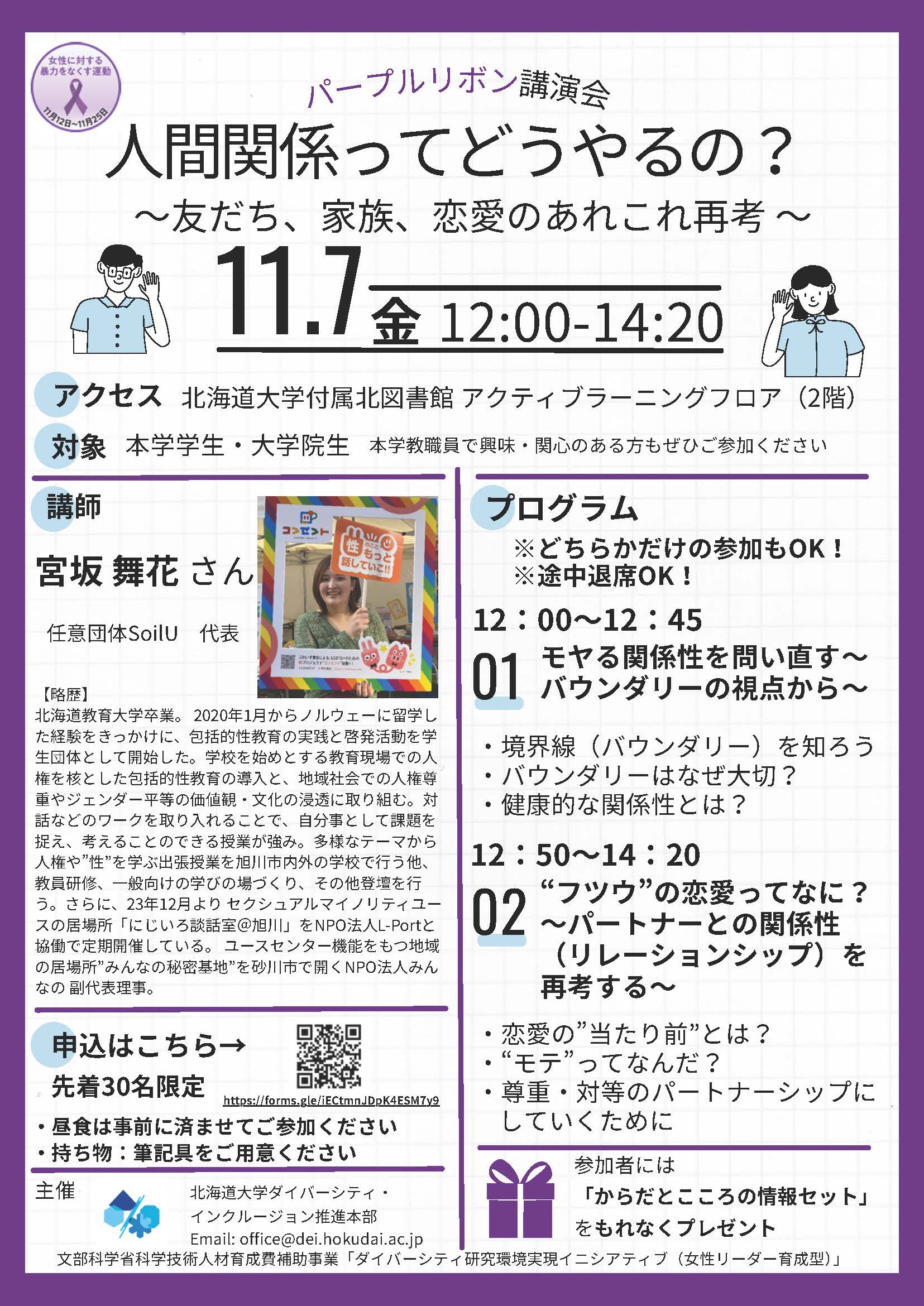 北海道大学は内閣府「女性に対する暴力をなくす運動」に強く賛同し、毎年運動期間(11月12日~25日)にあわせ、本学構成員に向けた講演会等を開催しています。今年度は特に学生・大学院生に向けて、自分と他者との境界線(バウンダリー)について身体、感情、意思、責任の観点から、互いを尊重し、良好な関係を築くとともに、自分自身を守る手段について学ぶ講演会を企画しました。ぜひご参加ください。