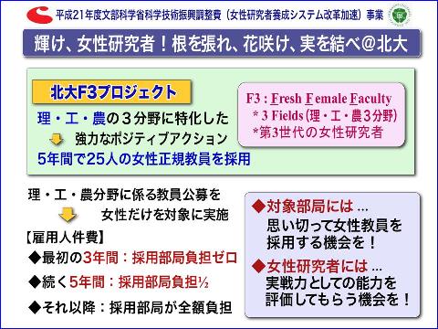文部科学省から提示された女性研究者支援事業「第2弾」に応えるべく、北大もこれまでの事業『輝け、女性研究者!活かす・育てる・支えるプラン in 北大』に続く『輝け、女性研究者!』シリーズ第2弾として、今回の提案『輝け、女性研究者!根を張れ、花咲け、実を結べ@北大』を申請しました。ますます輝け、女性研究者、というわけです。3年間の事業で進んだ環境整備・意識改革を踏まえて、この提案で私達が推進するのは「北大F3プロジェクト」。女性だというだけで能力を低く見られたり理不尽に否定されていた第1世代、男女雇用機会均等法により女性にも機会が与えられるようにはなったけれど活躍環境が整っていなかったため出産・育児等との両立困難で悔しい思いをした人がたくさんいる第2世代と比べて、本事業で「ぜひとも女性の力を科学技術の発展のためにもっと活かしたいから」と女性だけに門戸が開かれた公募により採用される理・工・農3つの分野(3 Fields)の新しい女性教員(Fresh Female Faculty)は第3世代(F3)の女性研究者と言えます。